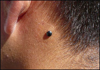 В пирсинге появилась новая популярная тенденция - установка микроякорей. Микроякорь вставляется не в сквозной прокол, а под кожу, что позволяет его установить в любом месте тела. Вот как это выглядит :